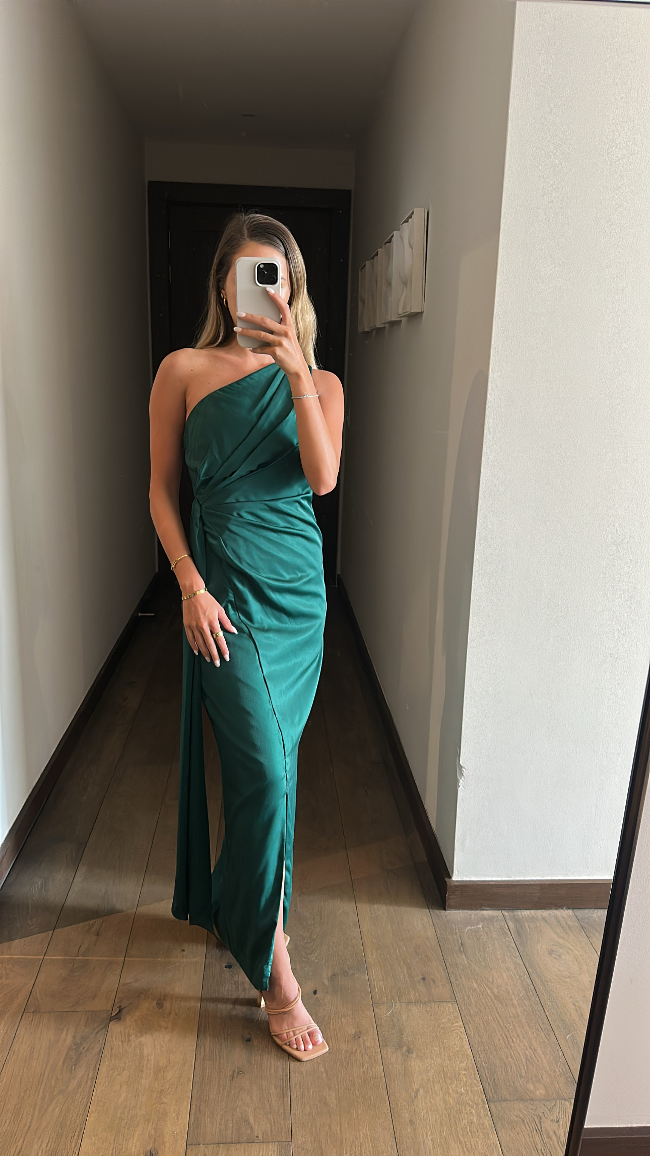 Vestido largo verde botella, una manga, tiene listón de cintura