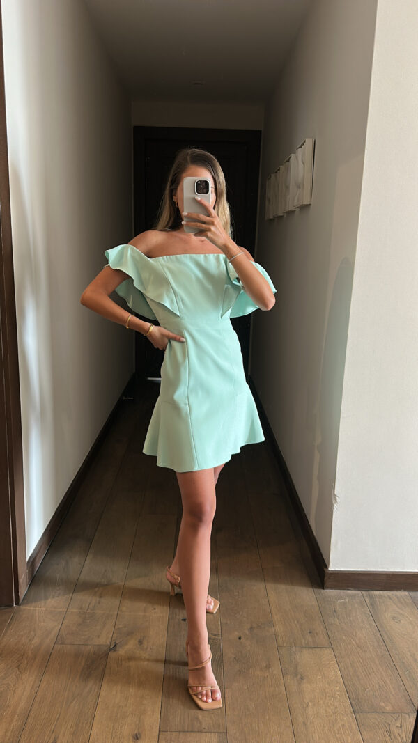 Vestido corto verde pastel, escote tipo stapless pero con manga