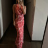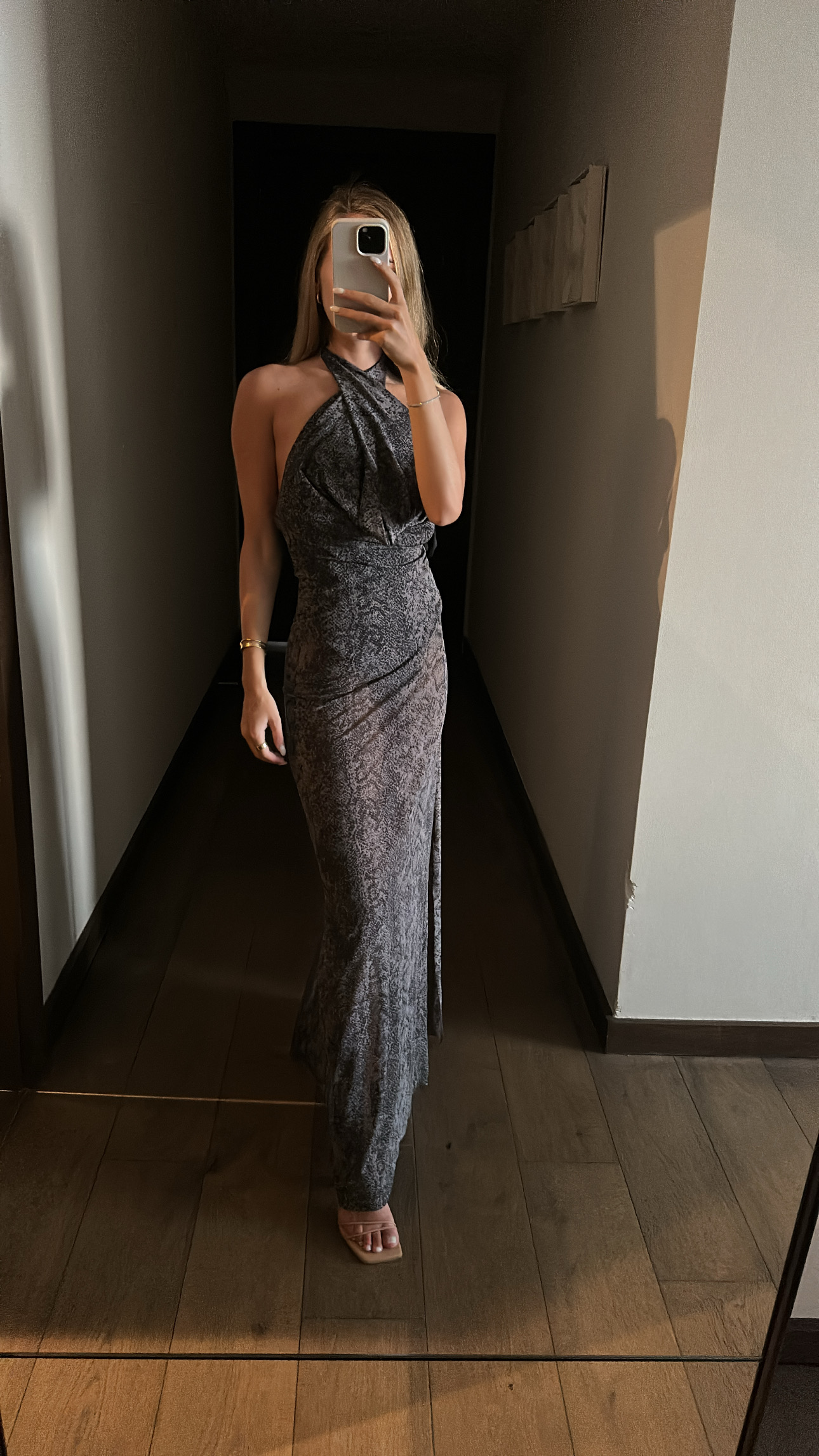 Vestido largo transparente, animal print gris con negro de tirantes, espalda abierta