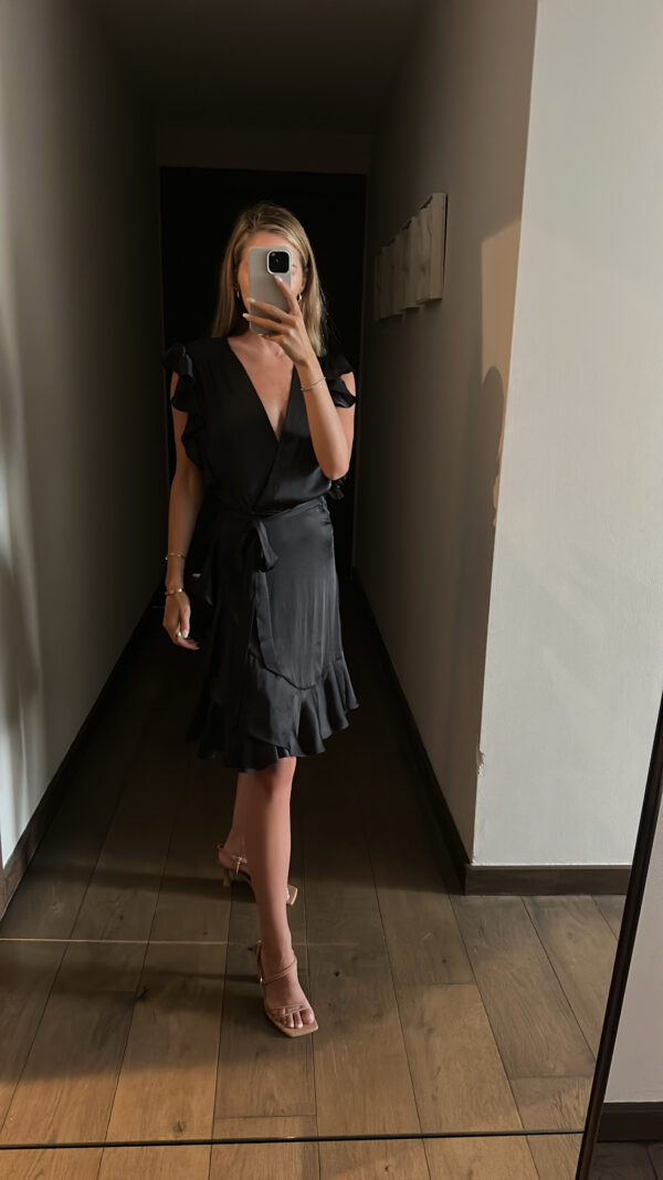 Vestido corto negro, escote en v, se amarra como bata, manga corta