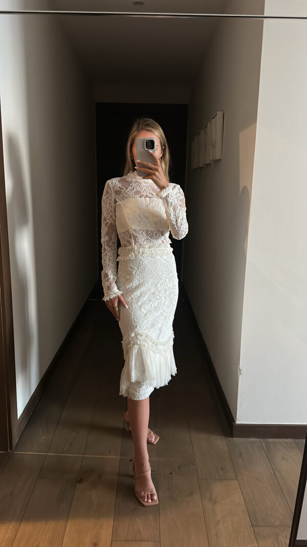 Vestido midi blanco de encaje, manga larga y cuello de tortuga