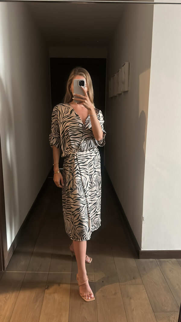 Vestido midi, escote en v, manga corta, tipo seda, print zebra negro con beige