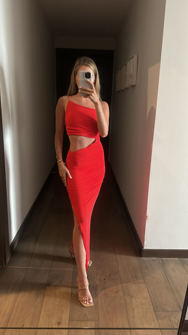 Vestido midi rojo tela tipo traje de baño, abierto de cintura